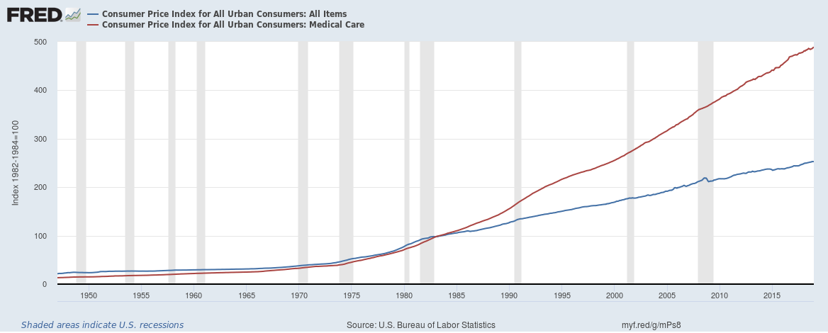 Figure 1: Consumer Price Index all items vs medical care -- From St Louis Federal Reserve Bank
